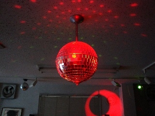 アクアグリーンのメインルームには天井からミラーボールがぶら下がっています。(それも大小ふたつです。)