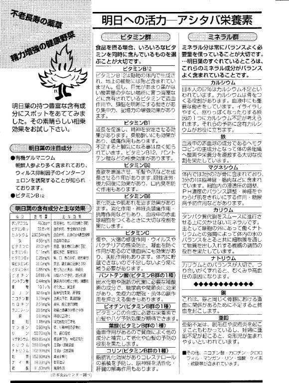 伊豆諸島で、土産品を開発する際は、とりあえず、明日葉の粉をまぜてみるのが定法であり、いわゆる健康食品として、粉末だけではなく、ケーキ、蕎麦、焼酎、お茶、こんにゃく、アイスクリーム、明日葉の根入りドリンク等、最近では明日葉が削り節のように仕上がった新製品が販売されている。